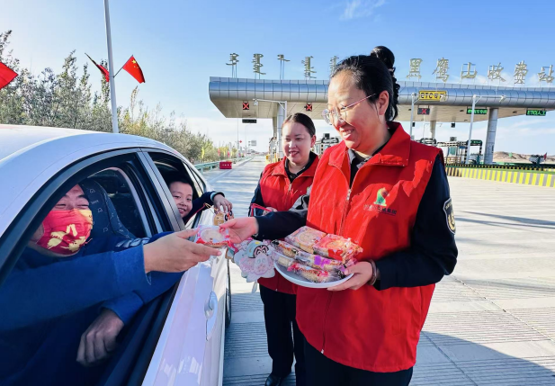 黑鹰山收费所紧扣“我们的节日”为主题,将收费车道化身“胡杨林司乘旅途驿站”。节前,职工提前搜集信息并制作最新版胡杨林旅游地图、定制印着“中秋快乐”月饼礼盒、熬好满壶姜茶,再亲手扎制玉兔桂花、胡杨叶等造型别致的花灯。工作人员在人工车道同步递上“第一口温度”——月饼与热姜茶,送上一盏贴满祝福的花灯,让中秋暖意沿车道奔向远方。