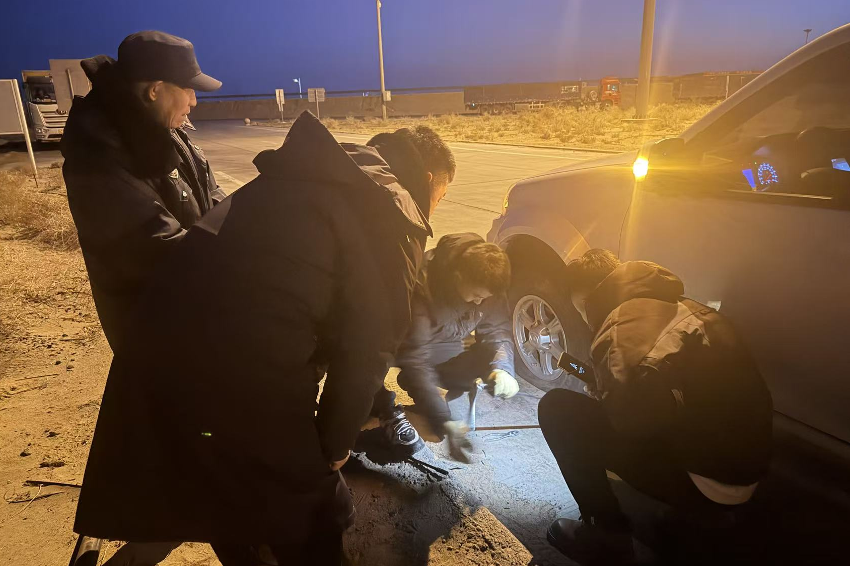 1月6日晚七点左右,刘先生驾驶一辆汽车行驶至赛汉陶来服务区时,突发爆胎导致车辆无法行驶,司机焦急前往服务区求助。工作人员得知情况后,迅速带工具赶往现场,同步联系专业汽修人员提供支援,一同为车辆更换备胎。当车辆重新启动后,工作人员再三叮嘱行车安全,暖心举动让旅客备受感动。