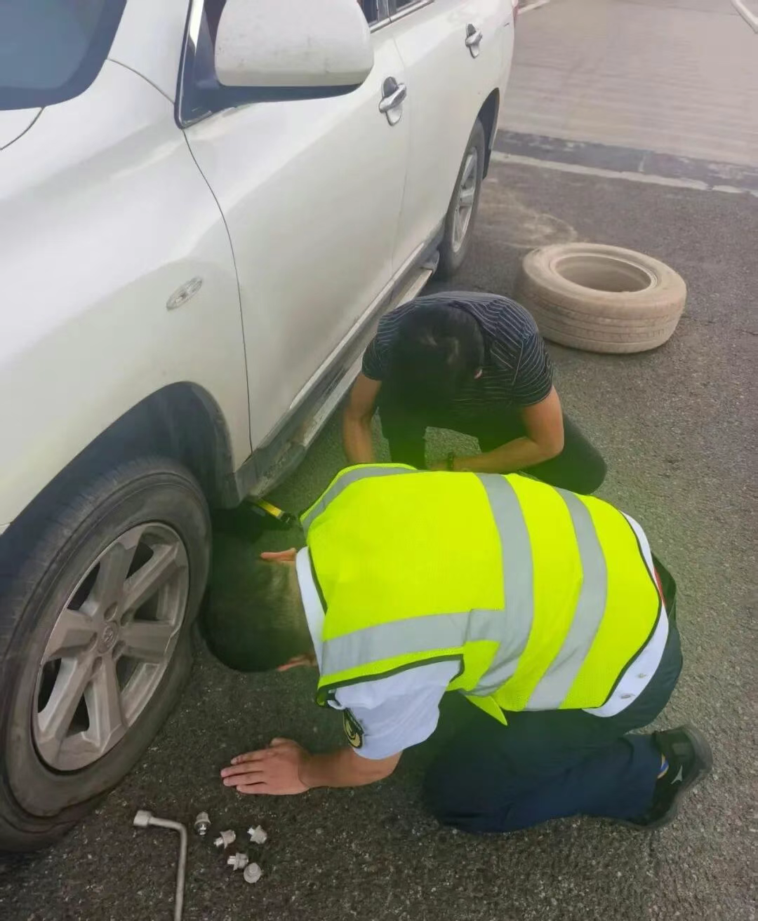 身穿荧光反光背心的工作人员第一时间上前询问,了解情况后,迅速从收费站内取来千斤顶、扳手等工具,与驾驶员合力开展更换轮胎工作。他们分工明确:有人稳稳顶起车辆,有人拧下螺丝、拆卸故障轮胎,再将备用胎安装到位,仔细拧紧每一颗螺丝;同时,其他工作人员则在一旁递送工具、留意路况,确保整个过程安全顺利。