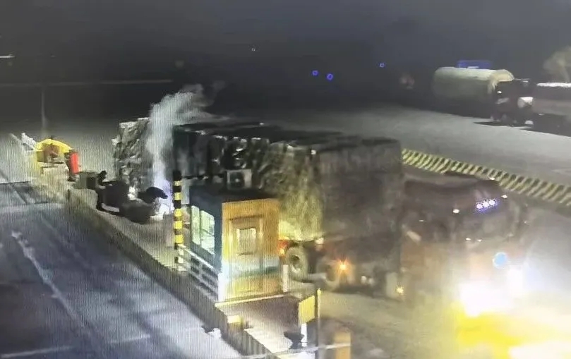 当日0时40分,一辆满载草捆的六轴货车驶入青山收费站入口车道。收费班长发现该车辆尾部冒出阵阵浓烟,车底甚至可见火苗闪动。他迅速判断这是轮胎摩擦过热引发的初期火情,果断提起灭火器冲向现场。“师傅,您的车着火了,快往前开到安全区!”他一边指挥司机将车辆驶离收费区域,一边精准操作灭火器,对准火源喷射干粉。整个过程衔接紧密、动作果断,不到两分钟,火势被彻底控制,险情成功排除。