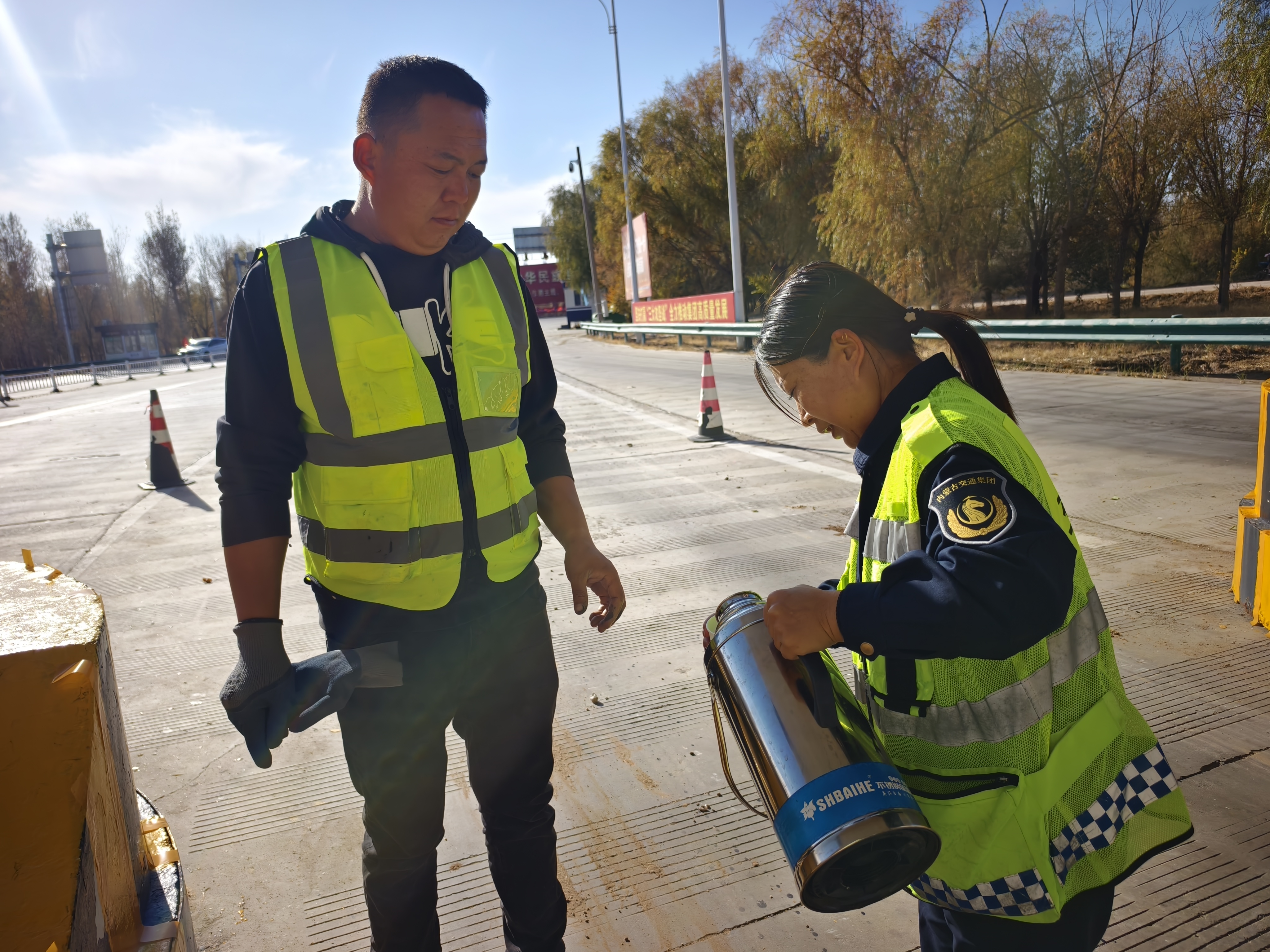 施工期间,收费员们坚守岗位,积极协调施工区域交通秩序,面对施工改造带来的通行调整与现场管理挑战,收费员们迅速行动,他们化身“交通指挥官”,在挖掘机等频繁作业的道口,以规范手势引导机械安全通行,避免施工与车辆通行产生冲突;根据施工进度动态划分通行区域,确保车辆分流有序。在保障施工效率和车辆顺利通行的同时,收费员们的目光也聚焦在一线施工人员的辛劳上。“天凉,喝口热水歇一歇!”简单的话语和温暖的热水,让忙碌的施工人员倍感贴心。他们都在这一暖心举动中感受到了尊重与温暖,施工的疲惫也随之消解了不少。