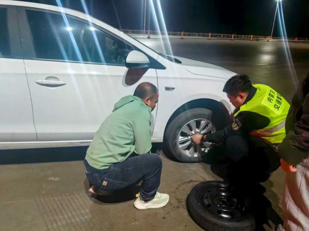 车主下车查看后发现,车辆右前轮胎已严重漏气、完全瘪掉,且自己既无换胎工具也缺乏操作经验,一时手足无措。收费员见状,引导该车到安全区域,并帮忙从车里拿出备胎和备用工具,俯身在车灯下忙碌起来——先稳固支撑车身,再逐一卸下旧胎螺丝,随后精准安装备胎并调试紧固。整个过程仅用15分钟,便帮车主解决了难题。