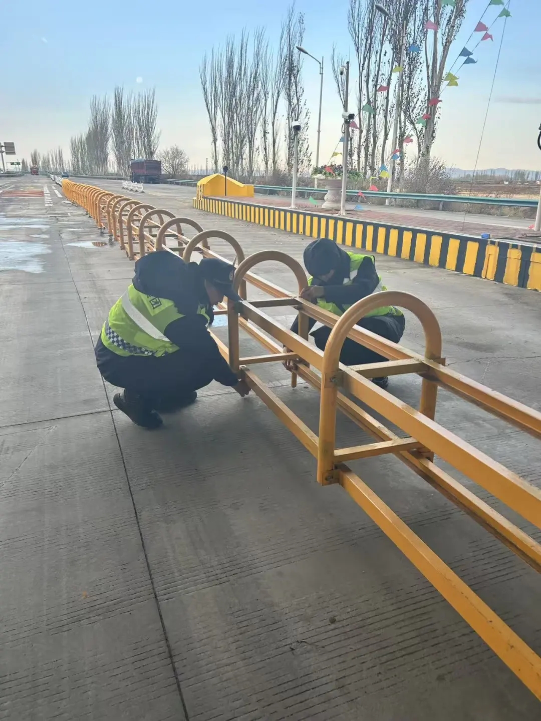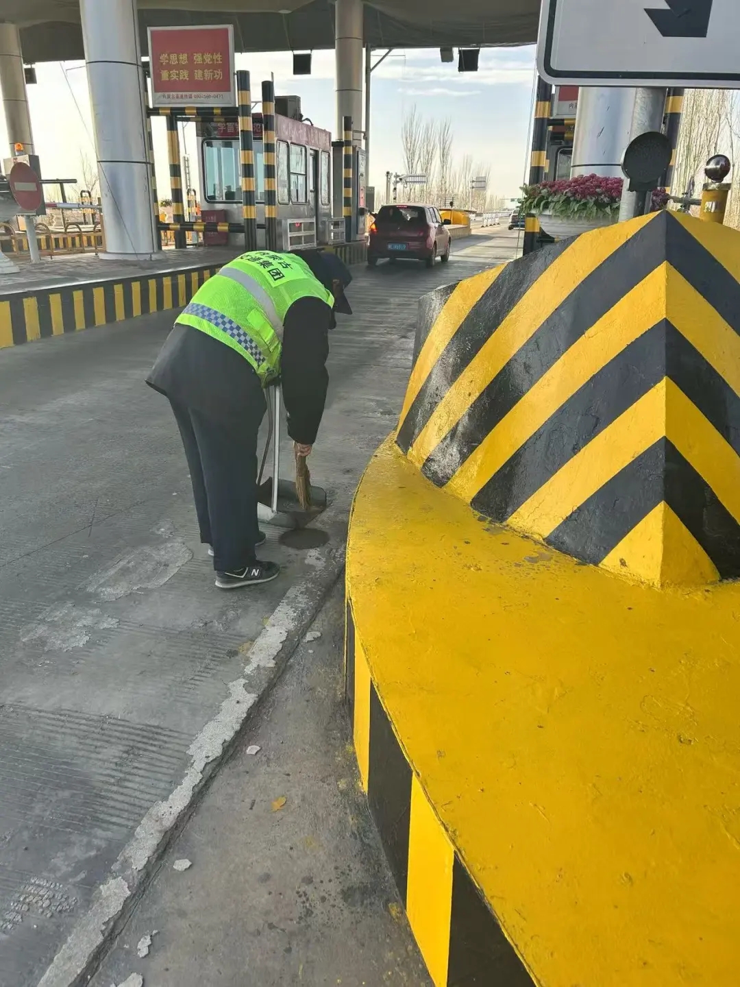 值班所长组织人员对收费车道、机电设备、标志标牌等重点部位进行逐项检查。加固松动的入口自助发卡机,固定超宽车道可移动护栏,清理收费区域散落物,防止意外事故发生。