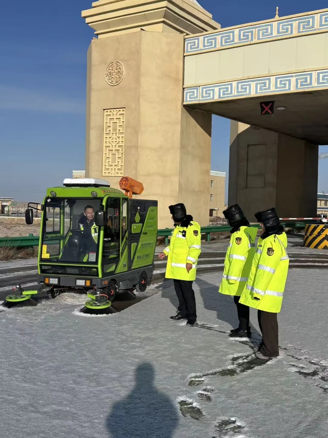 为保障道路畅通和司乘人员出行安全,前达门收费所以雪为令,同步协调内蒙古自治区交通运输综合行政执法总队十支队一大队启动除雪保畅应急预案,全体在岗职工迅速集结,全力投入在除雪保畅工作中。本次除雪工作主要以“机械+人工”方式相互结合,着重以清理车道积雪为主,避免雪融路化后天气下降产生路面结冰情况。在全力除雪保畅的同时,前达门收费所坚持“服务不减质、温情不降温”。收费窗口工作人员高效完成收费工作,同步以暖心话语提醒司乘“雪天路滑、请减速慢行、注意保持安全车距”。