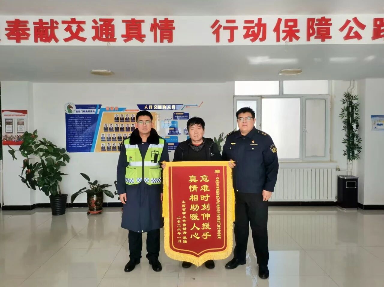 1月30日中午,一面印有“危难时刻伸援手 真情相助暖人心”的锦旗被送到了前达门收费所,送旗的正是此前遭遇货车爆燃险情的司机师傅。他紧紧握住收费所工作人员的手,反复表达着内心的感激。