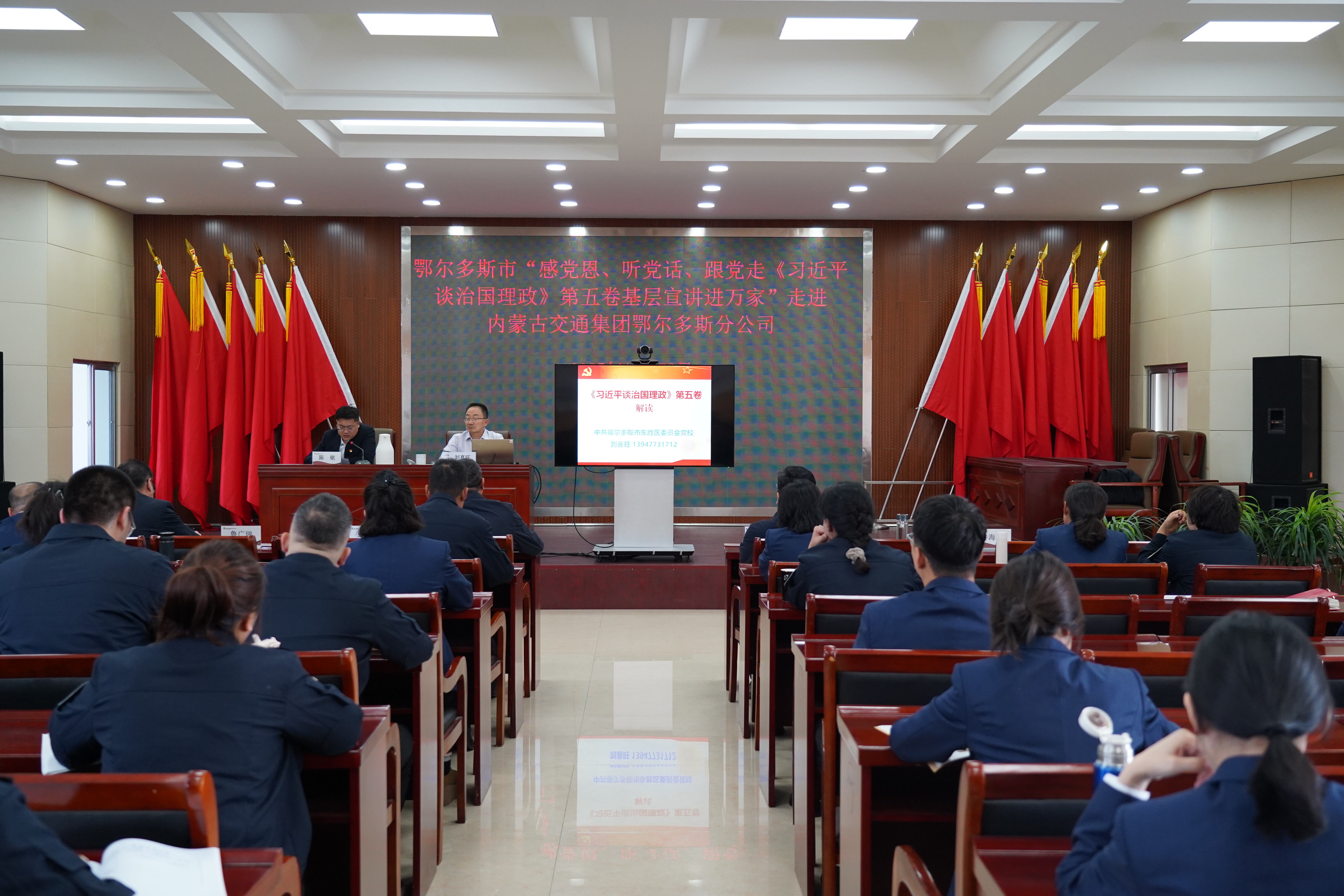 为深入学习领会《习近平谈治国理政》第五卷的丰富内涵与核心要义,推动学习贯彻习近平新时代中国特色社会主义思想走深走实,10月23日,鄂尔多斯市“感党恩、听党话、跟党走《习近平谈治国理政》第五卷基层宣讲进万家”走进内蒙古交通集团有限公司鄂尔多斯分公司。分公司领导班子、机关全体党员、基层各单位负责人、党务干事、年轻干部及党外知识分子共同参加学习。