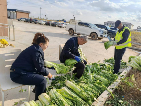 为丰富冬季餐桌、节约食堂开支,马王庙收费所职工自发开展起一年一度的冬储行动。大家分工协作,有人挖土捡蔓菁,有人切白菜、扎大葱,还有人负责将初加工的蔬菜入缸腌制——全程没有专人指挥,却处处是职工们主动参与的身影。