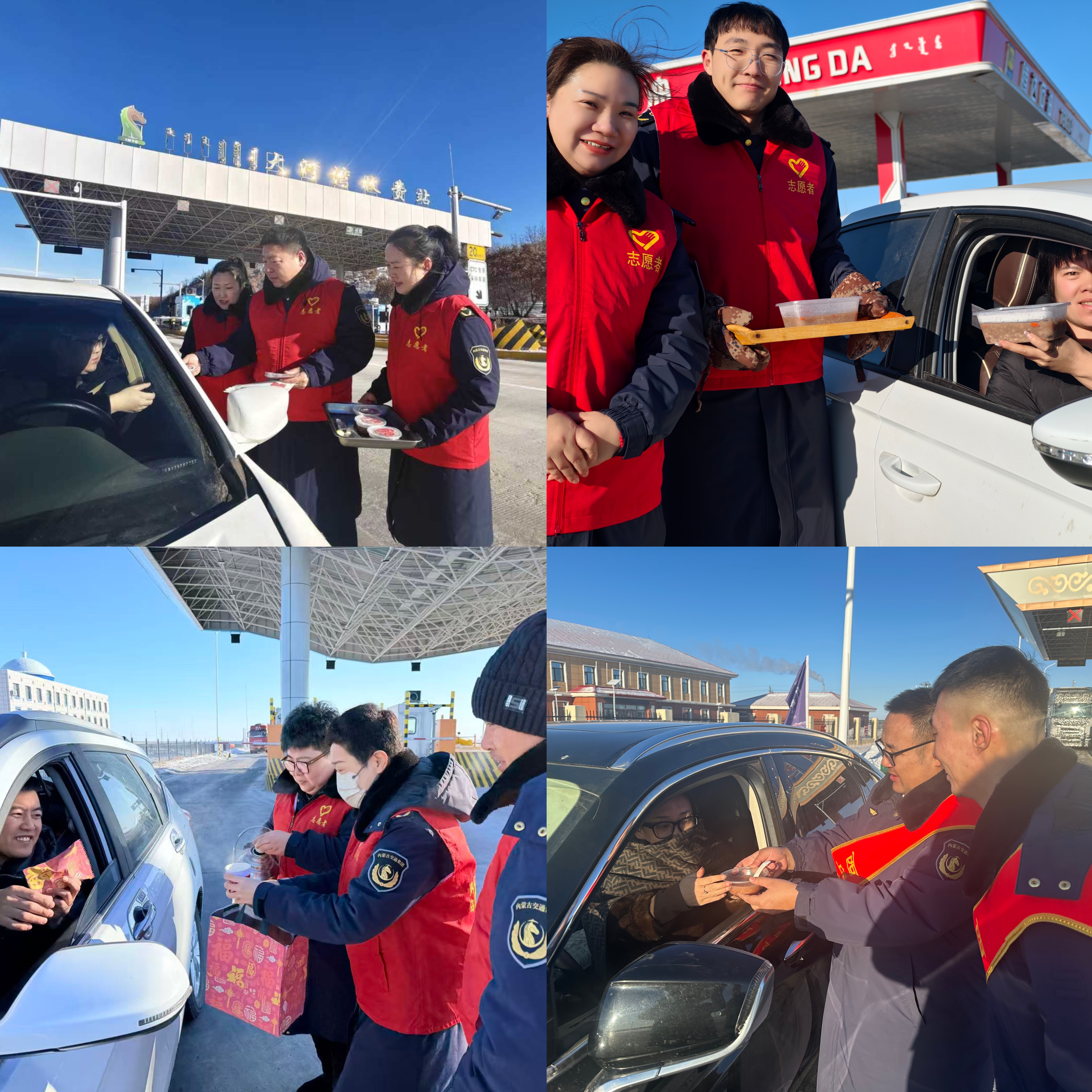 志愿者们身着统一志愿马甲,精神饱满地在收费广场开展志愿服务。主动上前与司乘人员热情问候,将腊八粥、福袋递到司乘手中。真挚的笑容、暖心的话语搭配滚烫的热饮,瞬间驱散了司乘们旅途的疲惫与冬日的寒冷。