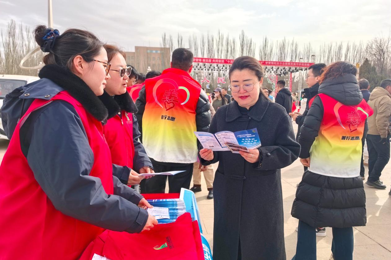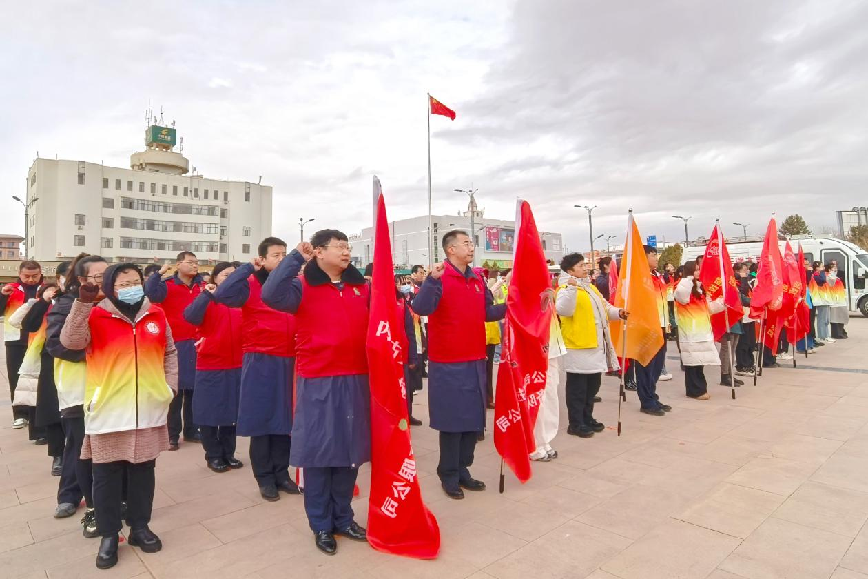 活动当天,在阿左旗巴彦浩特新世纪广场主会场,分公司志愿者身着统一服装,精神饱满地参加了启动仪式。在集体宣誓环节,大家庄严举起右拳,重温志愿服务精神,表达了践行初心使命、服务群众的坚定决心。分公司志愿者服务队旗帜在广场上迎风招展,成为活动现场一道亮丽的风景线。