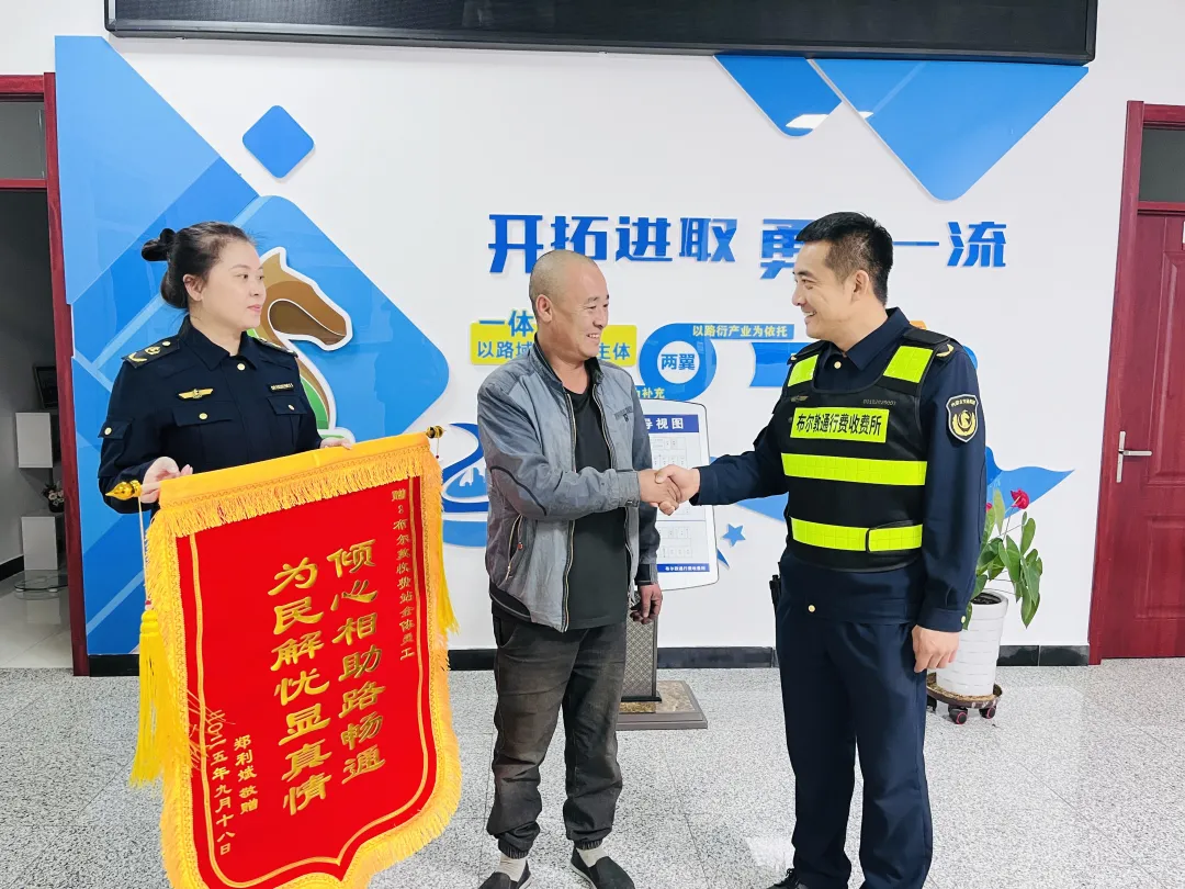 “真是太感谢你们了!我的车突然爆胎起火,我当时脑子一片空白,幸好有你们出手相救!”近日,货车司机郑师傅专程来到布尔敦收费所,将一面印有“倾心相助路畅通,为民解忧显真情”的锦旗递到工作人员手中,再三表达感激之情。
