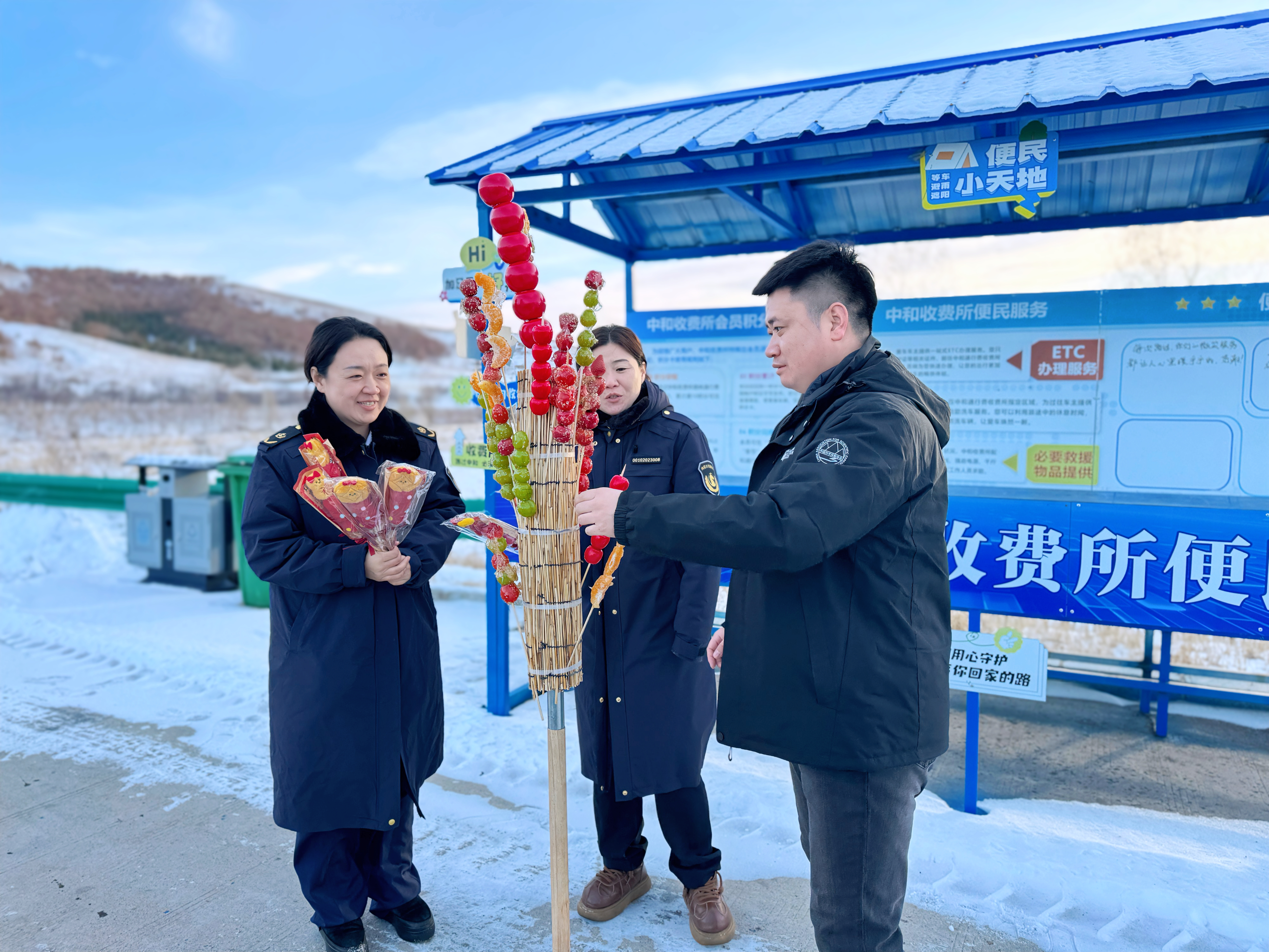 中和收费所职工坚守岗位,布置元旦装饰打卡背景墙,为过往司乘送上冰糖葫芦,在喜庆祥和的气氛里守护道路平安,用坚守诠释交通人的责任与担当。