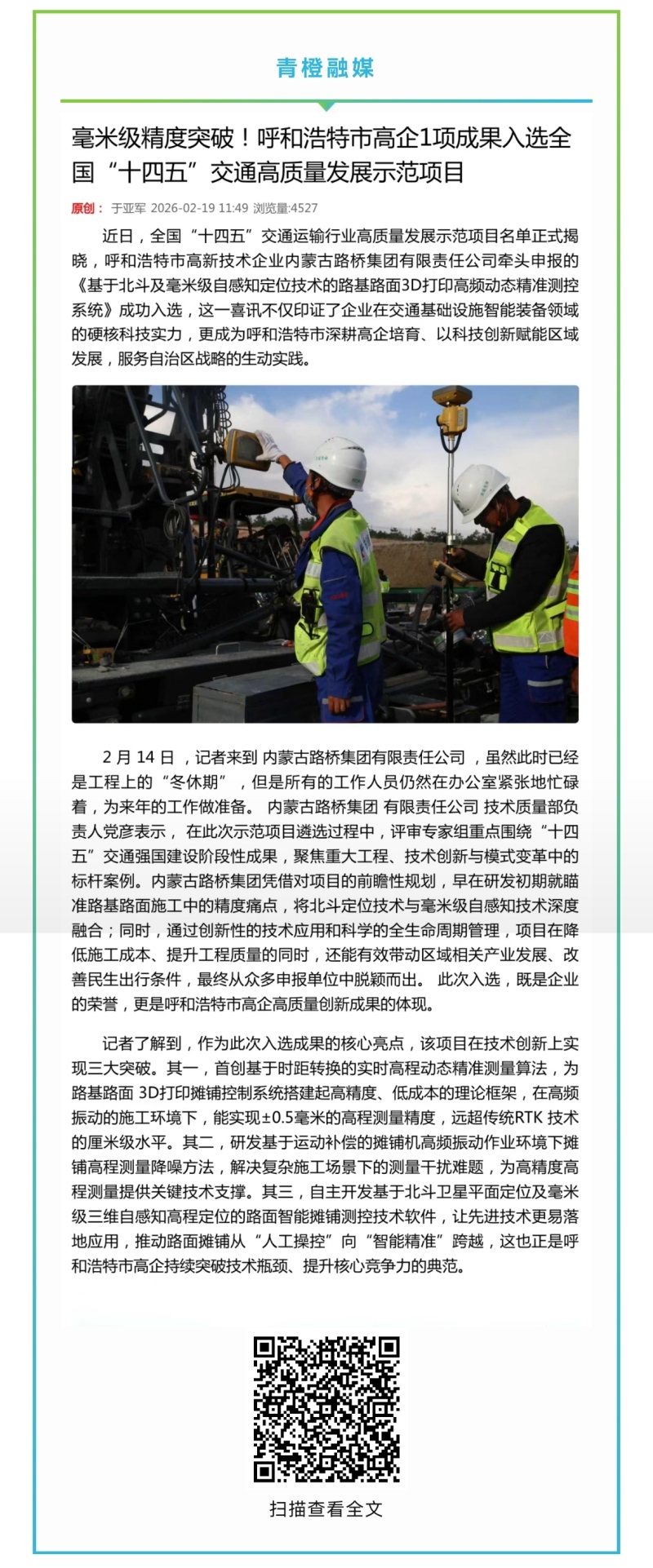 青橙融媒|喜报!内蒙古交通集团所属内蒙古路桥集团有限责任公司1项成果入选全国“十四五”交通高质量发展示范项目