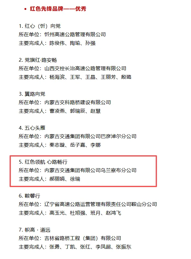 2月4日,首届全国公路交通行业优秀品牌推选宣传活动结果揭晓,乌兰察布分公司党委打造的“红色领航 心路畅行”党建品牌,荣获“红色先锋优秀品牌”称号。这一荣誉是对分公司坚持党建引领、推动党建与业务深度融合的充分肯定,也是对分公司在新时代国有企业党建工作创新实践中的高度认可。