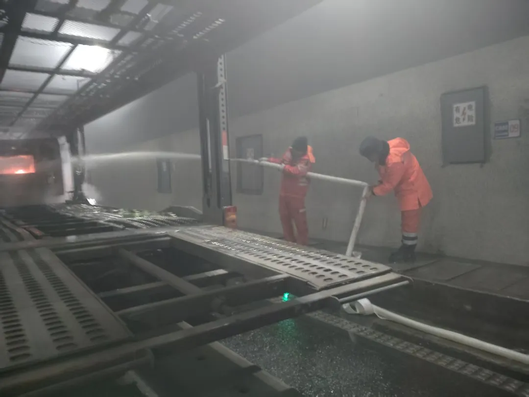 现场火势凶猛,伴随持续爆燃,浓烟裹挟热浪窜出,能见度极低。且货车周边密布隧道供电、通风等关键线路,火势一旦蔓延,极易引发系统瘫痪,后果不堪设想。面对风险,救援人员毫无惧色、冲锋在前,通过常备的灭火设备精准扑救。大家沉着运用日常演练积累的技能经验,精准判断火势走向,科学调整战术、协同作战,有效遏制了火势扩散。