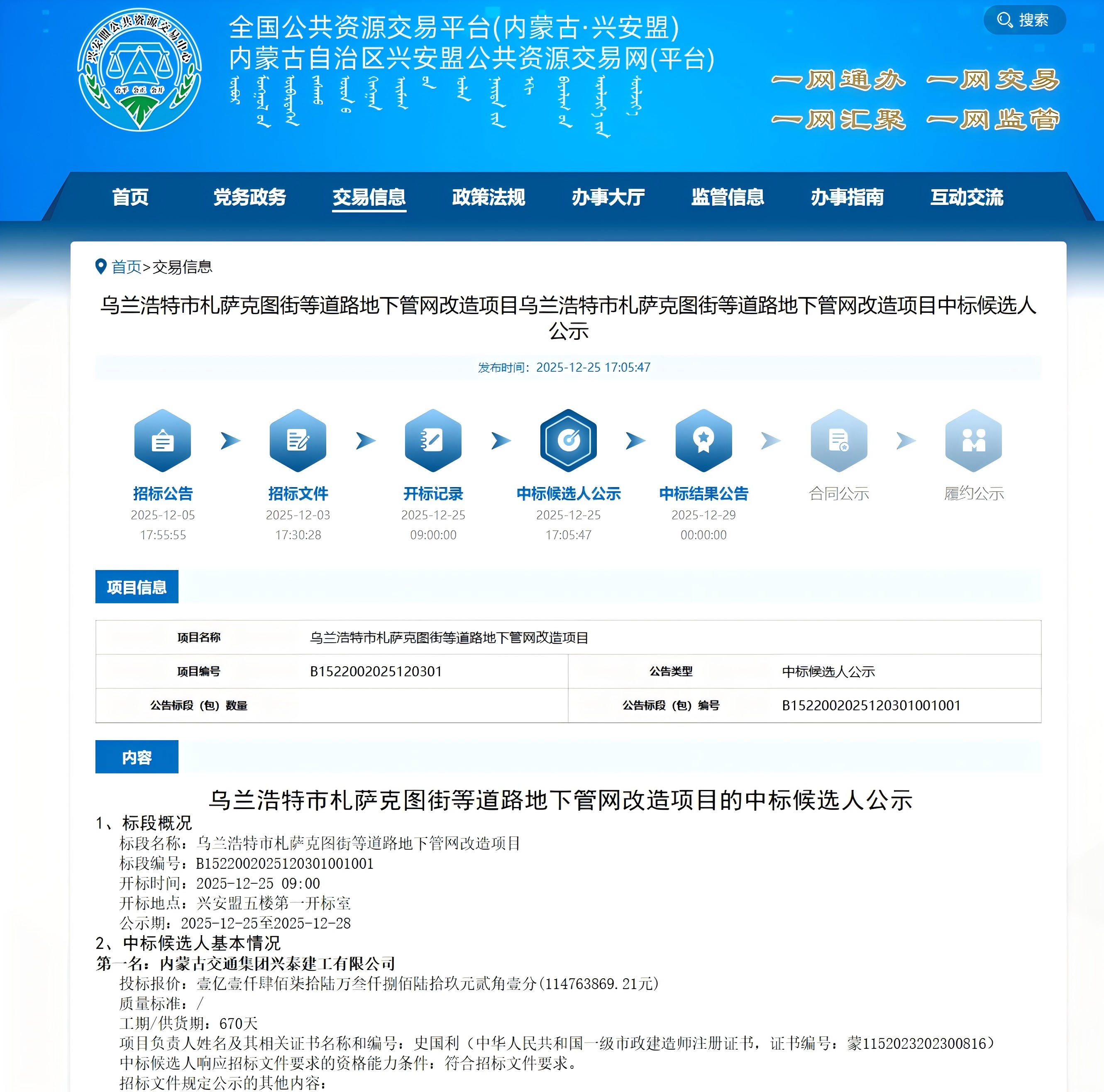 12月29日,兴安分公司充分发挥区域统筹联动优势,全程赋能集团兴泰建工有限公司投标工作,成功中标乌兰浩特市札萨克图街等道路地下管网改造项目。该项目中标金额1.1亿元,作为地方基础设施升级的重点工程,建成后将全面优化区域地下管网布局,提升供水、排水等公共服务保障能力,为乌兰浩特市城市功能完善与民生改善筑牢坚实基础。