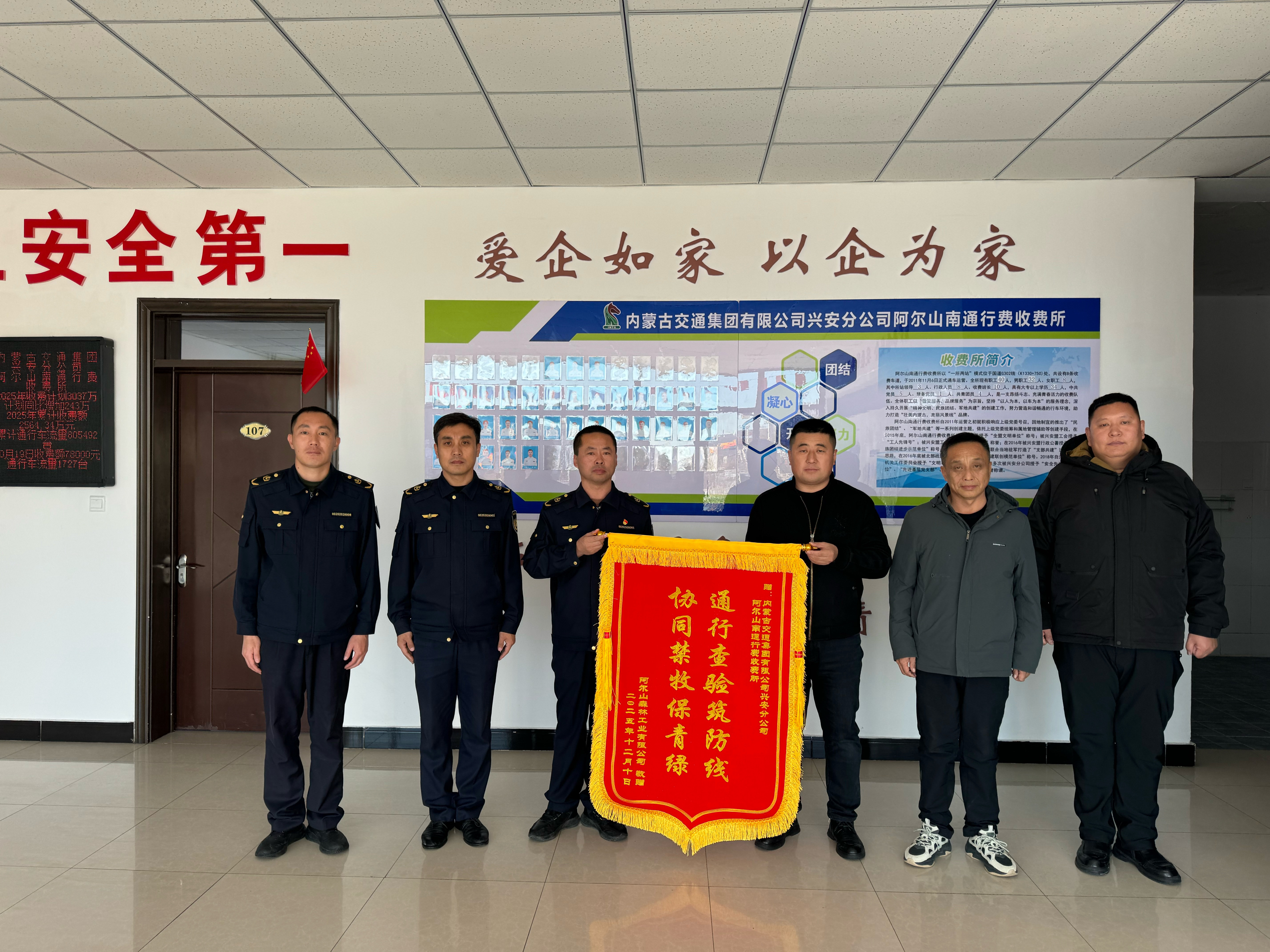近日,阿尔山森林工业有限公司工作人员将一面印有“通行查验筑防线 协同禁牧保青绿”的锦旗赠送给了阿尔山南收费所,感谢收费所全体人员在区域生态保护与禁牧管控工作中的大力支持和配合。