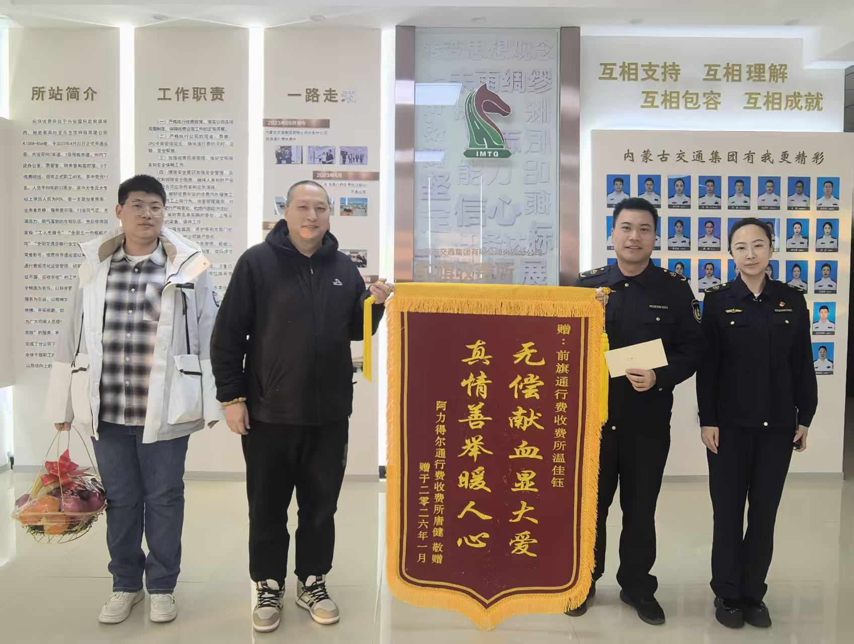 近日,阿力得尔收费所职工唐健将一面印有“无偿献血显大爱 真情善举暖人心”的锦旗,送到前旗收费所职工温佳钰手中,以此致谢他在危难时刻挺身而出,用400CC热血为自己重病的母亲延续生命。