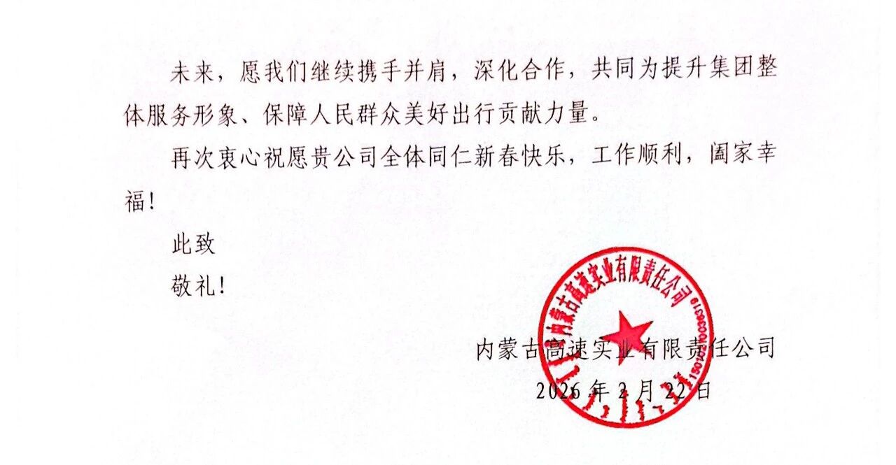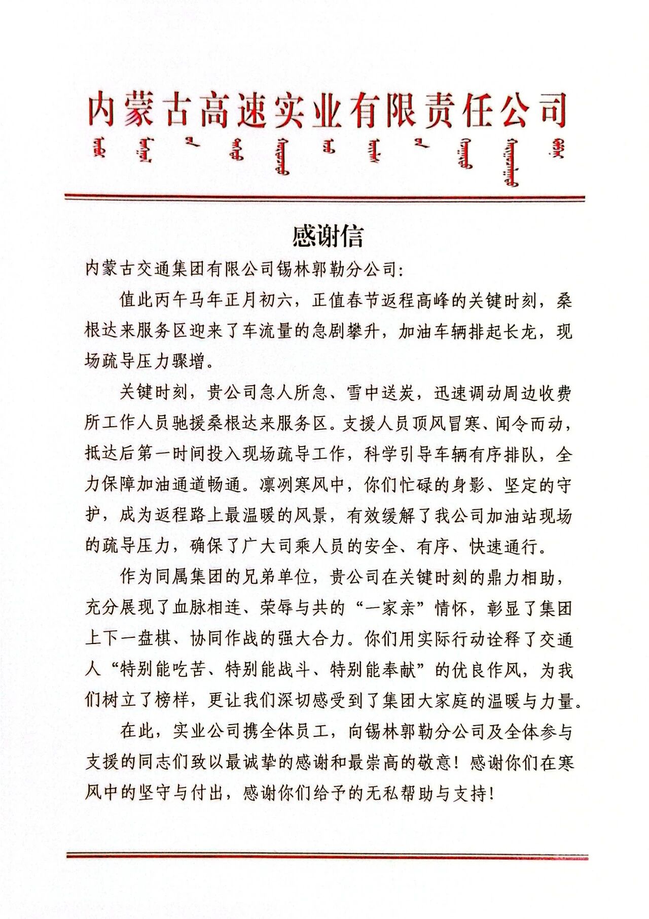 2月22日,内蒙古交通集团锡林郭勒分公司收到内蒙古高速实业有限责任公司感谢信,对锡林郭勒分公司在春节返程高峰期间增派职工驰援桑根达来东服务区加油站疏导交通,保障加油通道畅通表示感谢。