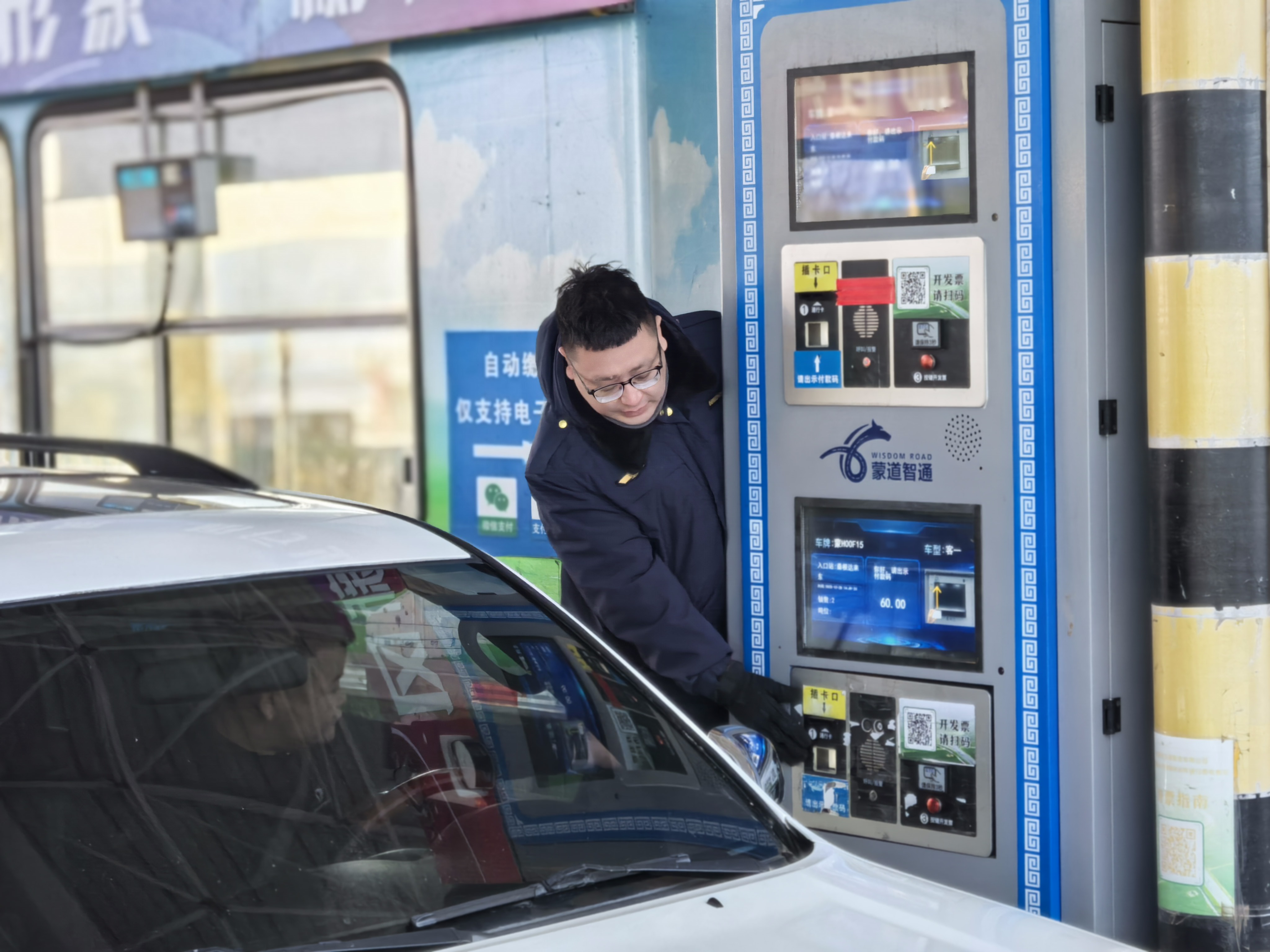 锡林浩特收费所工作人员协助司乘高效办理自助通行缴费,耐心向货车司机讲解通行政策及服务指南,以细致服务保障司乘一路畅行。