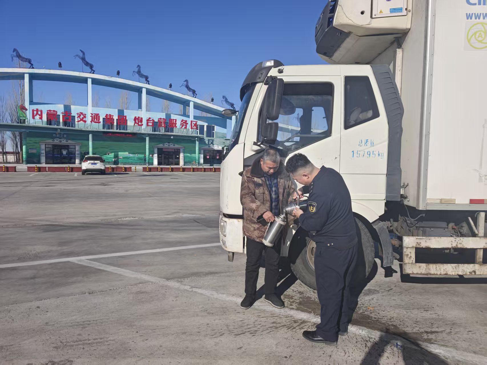 炮台营服务区聚焦春运广大司乘出行需求,细化便民服务举措。工作人员主动为停靠的司乘加注热水,用细致入微的服务解决旅途中的需求,让奔波在春运路上的司乘感受到实实在在的温暖。