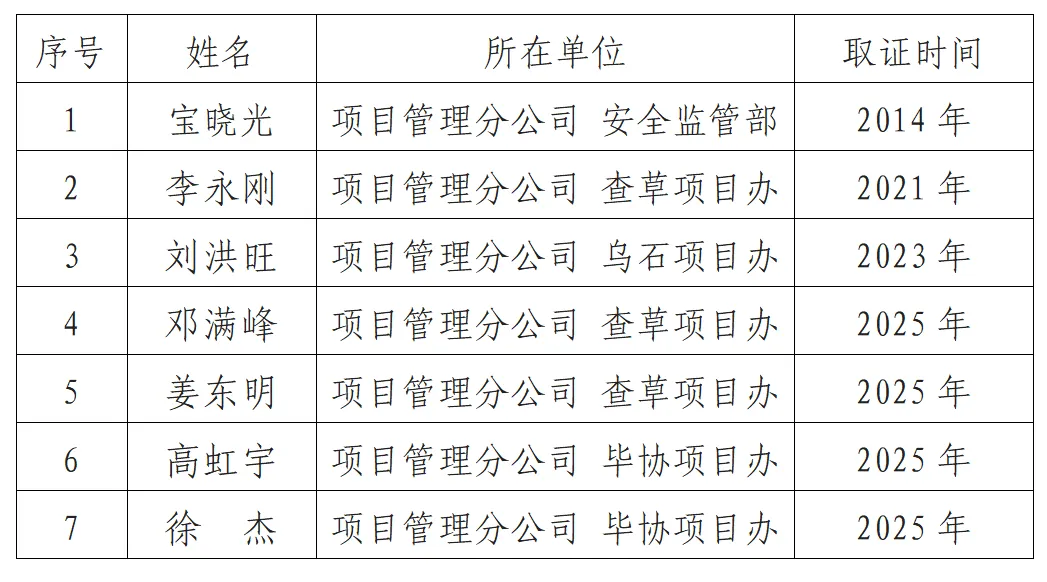 项目管理分公司传捷报——查草项目办邓满峰、姜东明及毕协项目办高宏宇、徐杰4人顺利通过2025年度国家注册安全工程师考试。这是项目管理分公司贯彻落实集团公司“十个目标年”行动,以考促学,以学促干,提升安全管理效能,打造高素质专业化安全管理队伍取得的又一成果。截至目前,分公司共有7名职工取得注册安全工程师证书,为分公司安全监管队伍注入强劲专业力量。